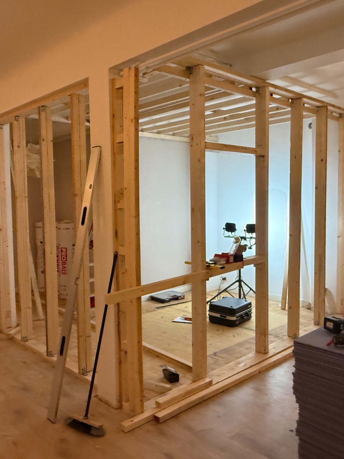 Diverse Wände müssen errichtet werden. Dabei ist auf die Akustische Eigenschaft, die ein Messraum besitzen muss zu achten.